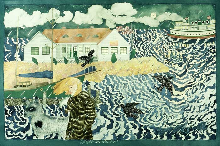 "Winter in the Port" captured my first impressions of moving to Port Townsend in 1980. The fierce wind muscled the water over the edges of the dock as I headed to the boat with the harbor dog. My ideas were full of hope for an undefined future, seduced by being close to the water once again. I felt optimistic even during the drama of unrelenting winter winds.